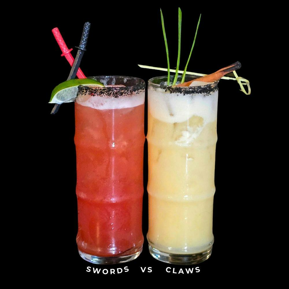 Which side are you on: Swords with gin, Cointreau, Heering cherry liqueur, Benedictine, pineapple juice, lime juice or Claws with rum, pineapple, juice, orange juice, and coconut? Regardless of which side you’re on, you’re in for a battle of delicious flavors