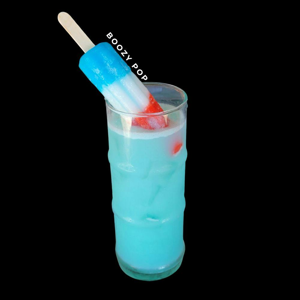 Cool off with our Boozy Pop with rum, pineapple juice, lime juice, coconut, blue curacao and topped with a refreshing popsicle. It’s the perfect Summer treat to help beat the heat